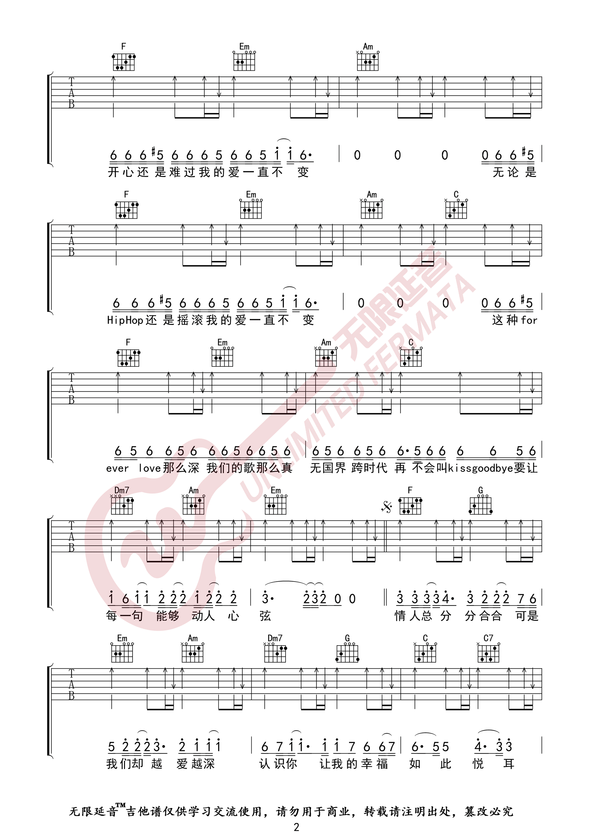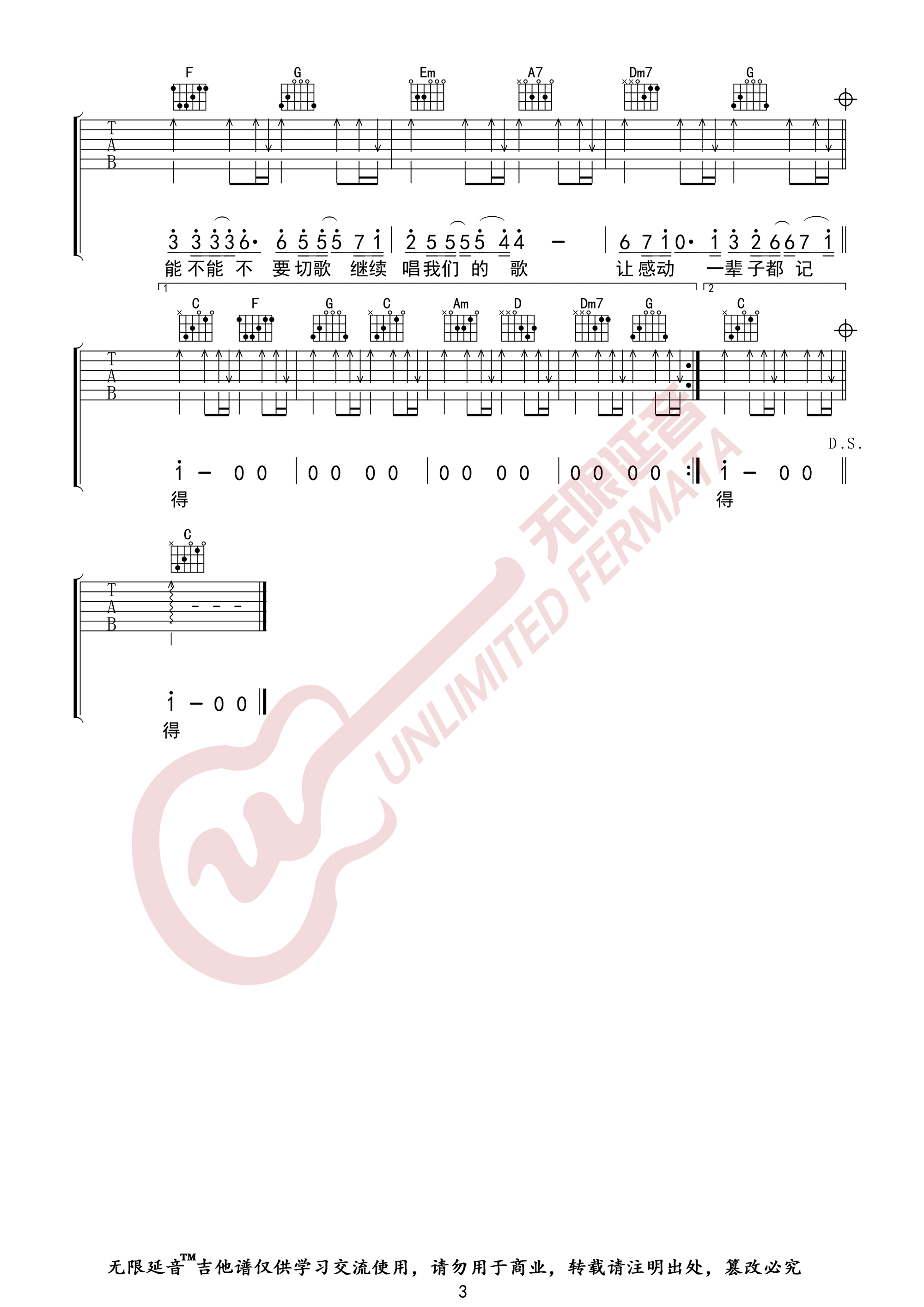 歌曲原调为#C调,此版本的曲谱来源于@无限延音,为4/4拍的节奏,按C调指法编配,共3张高清吉他谱,变调夹1品为原歌曲的调式,演唱时可按个人音域选择合适的变调夹位置。