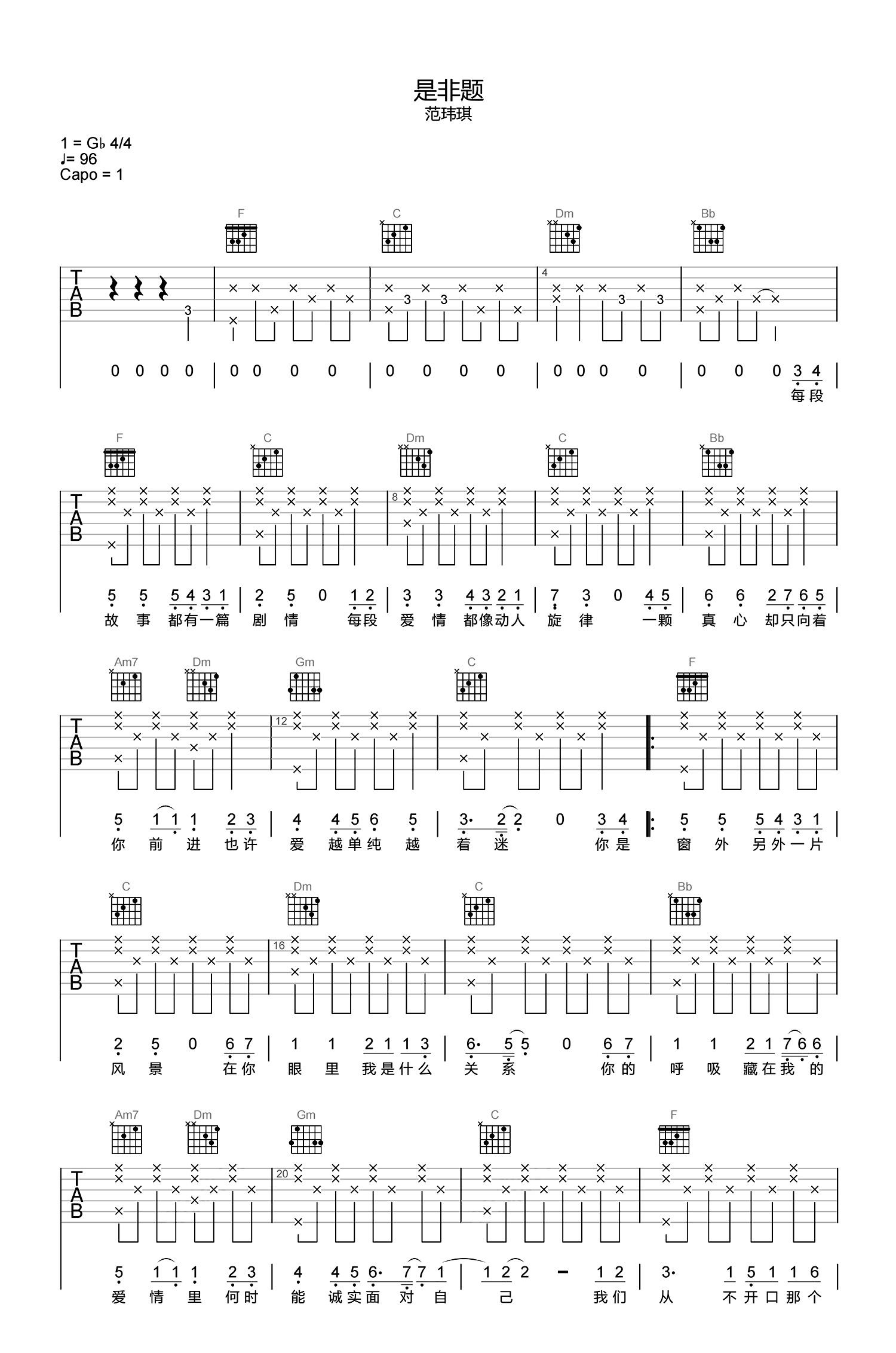 范玮琪《是非题》吉他谱 G调带前奏曲谱