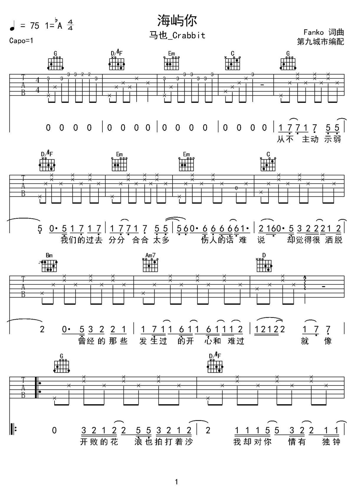 马也_crabbit《海屿你》吉他谱 G调和弦弹唱谱