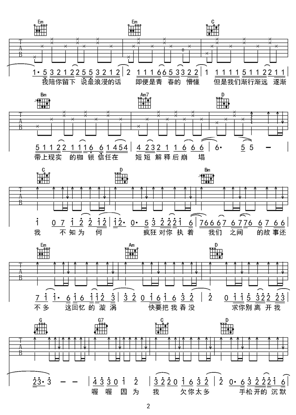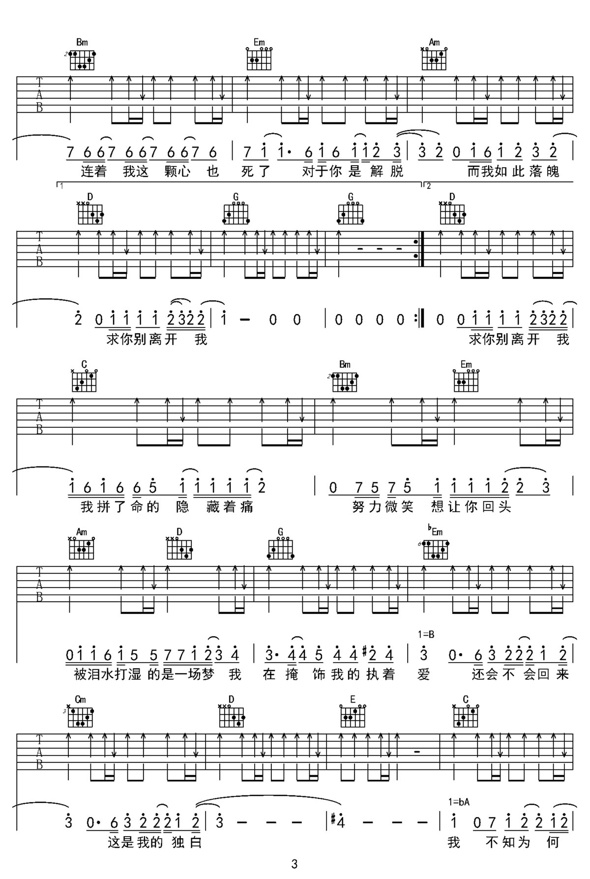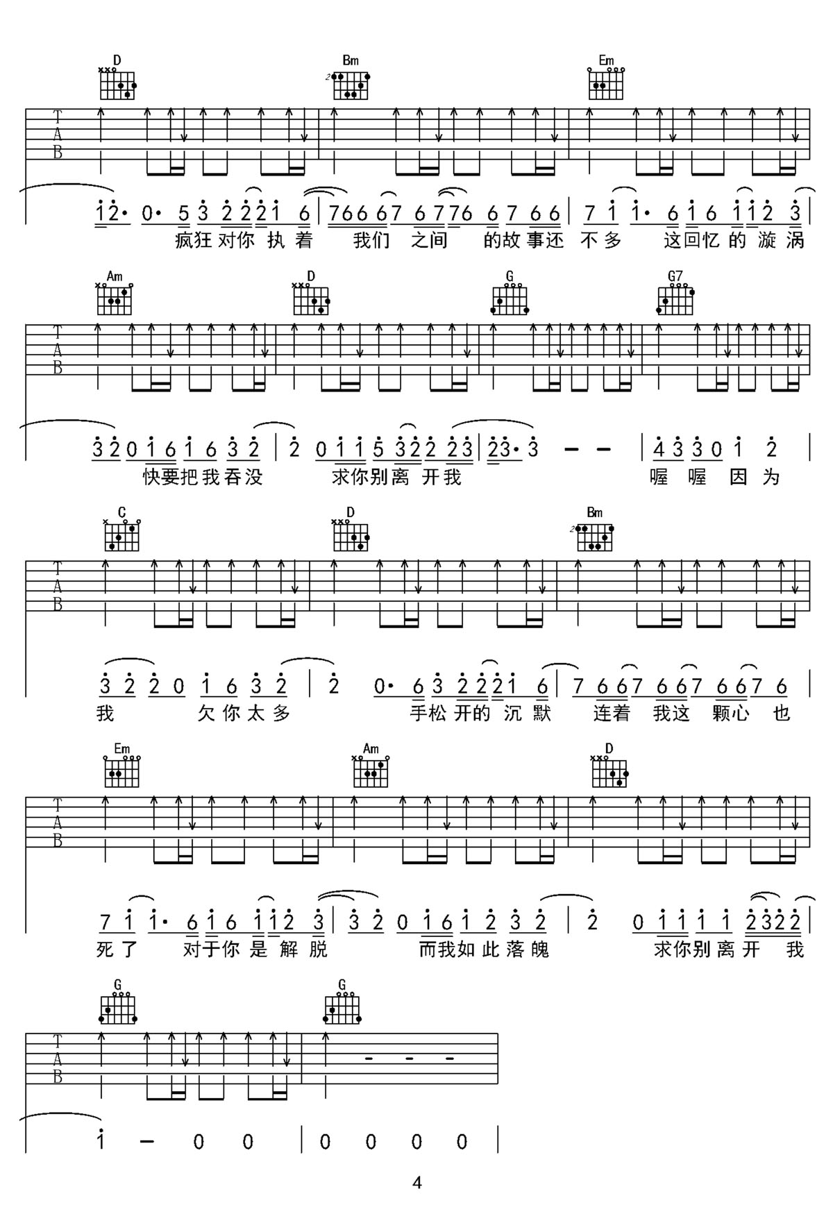 歌曲原调为降A调,此版本的曲谱来源于第九城市,节拍4/4,按G调指法编配,此曲谱共 4 张图谱,变调夹1品为原歌曲的调式,演唱时可按个人音域选择合适的变调夹位置。