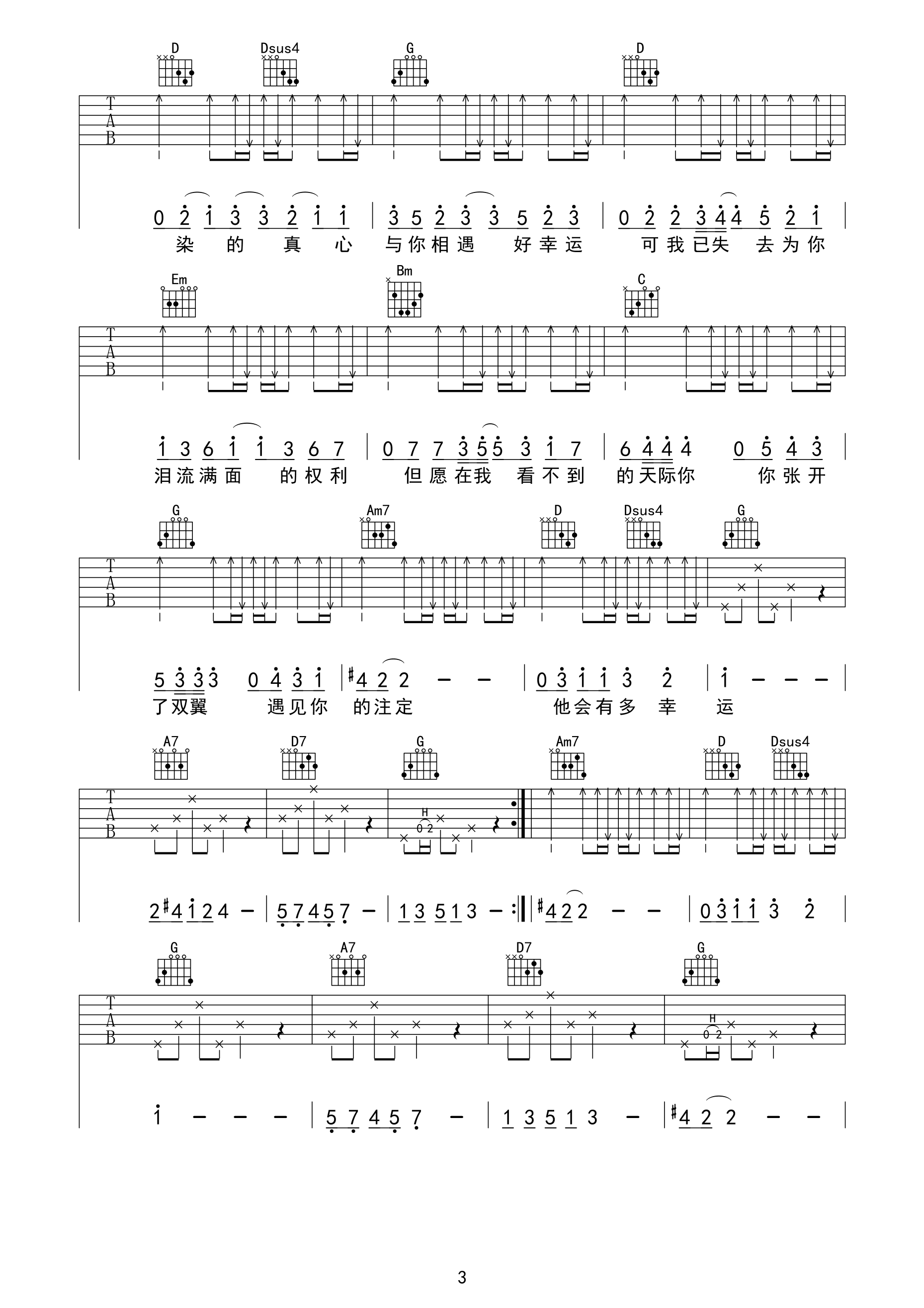 歌曲原调为B调,此版本的曲谱来源于@又又吉他,为4/4拍的节奏,按G调指法编配,共3张高清吉他谱,变调夹4品为原歌曲的调式,演唱时可按个人音域选择合适的变调夹位置。