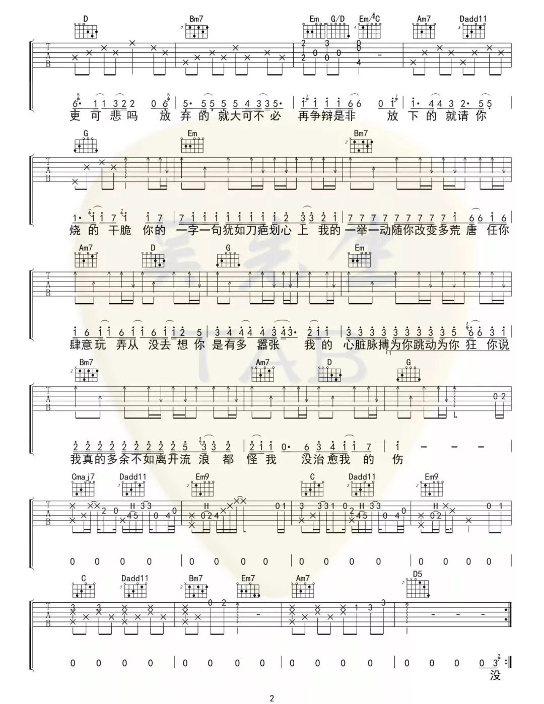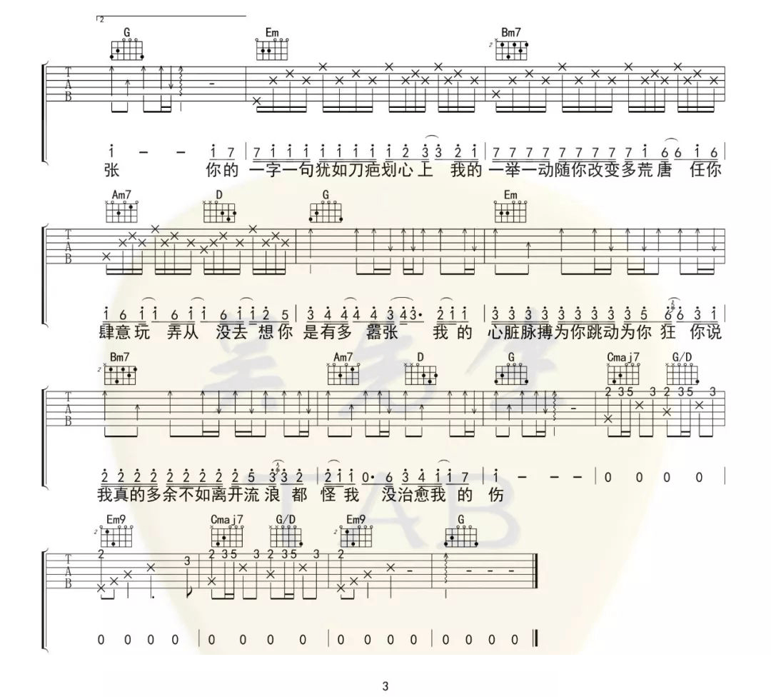 歌曲原调为B调,此版本的曲谱来源于@吴先生TAB,为4/4拍的节奏,按G调指法编配,共3张高清吉他谱,变调夹4品为原歌曲的调式,演唱时可按个人音域选择合适的变调夹位置。