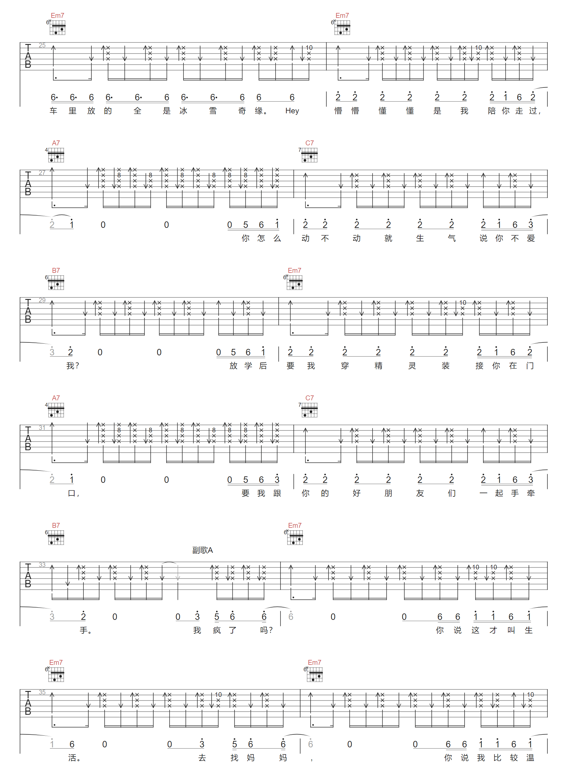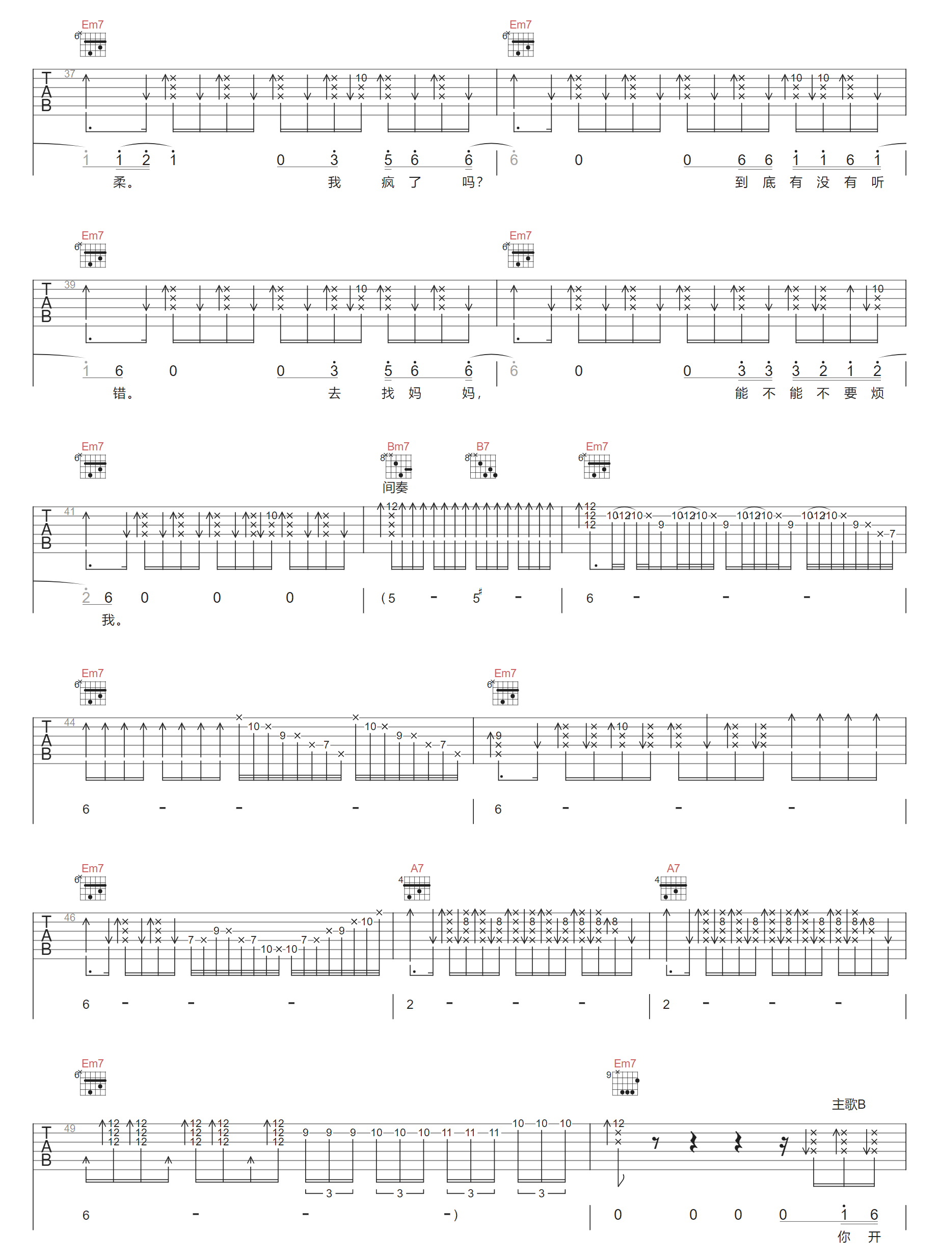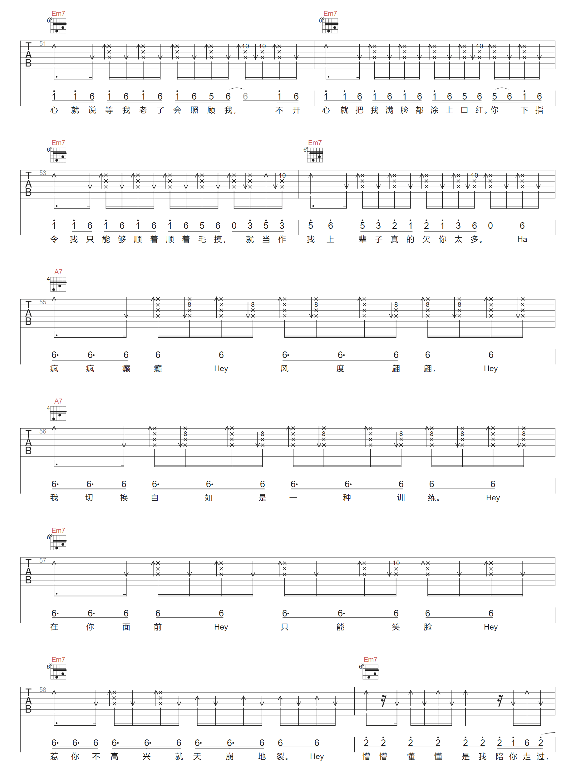 歌曲原调为降A调,此版本的曲谱来源于@濮宇,为4/4拍的节奏,按G调指法编配,共7张高清吉他谱,变调夹1品为原歌曲的调式,演唱时可按个人音域选择合适的变调夹位置。