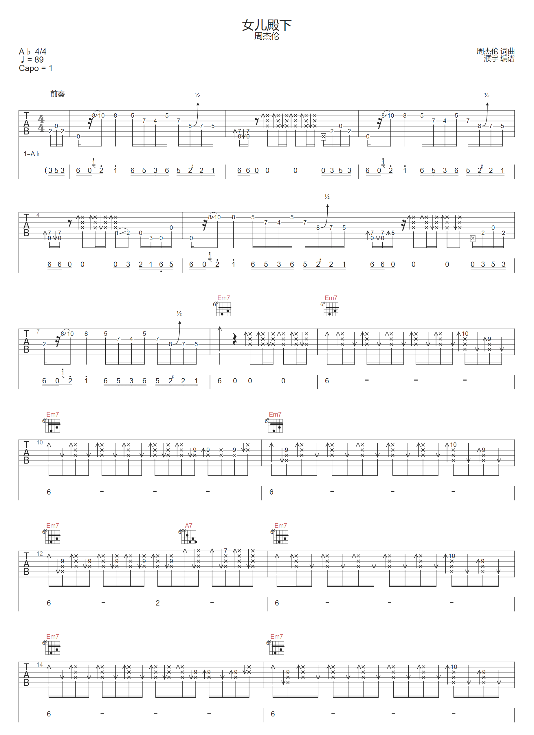 周杰伦《女儿殿下》吉他谱 G调弹唱谱