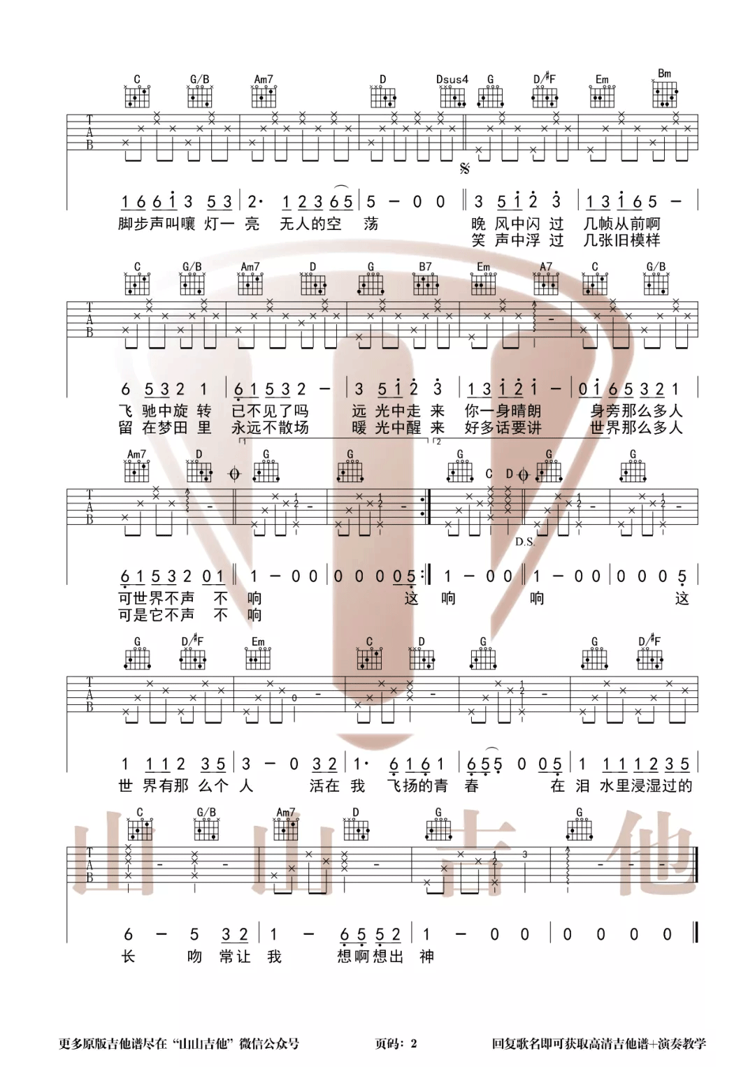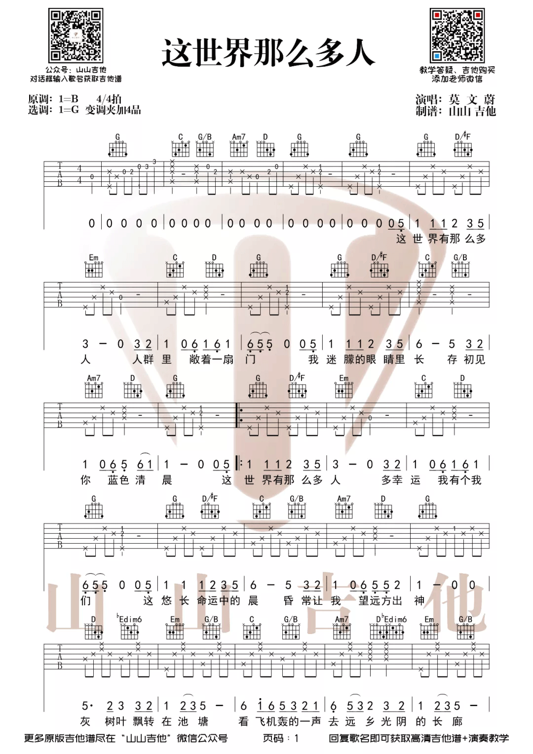 歌曲原调为B调,此版本的曲谱来源于@山山吉他,为4/4拍的节奏,按G调指法编配,共2张高清吉他谱,变调夹4品为原歌曲的调式,演唱时可按个人音域选择合适的变调夹位置。